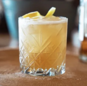 3/ Mettez un glaçon dans un verre & versez le mélange (sans les glaçons du shaker) (Place a fresh ice cube in a glass and strain the mixture over it.)